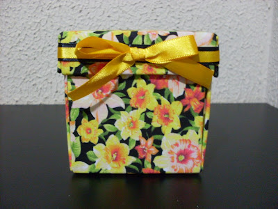 Por fim, forramos a tampa com o tecido escolhido e usamos uma fita acetinada para fechar e fixar os cantos.
