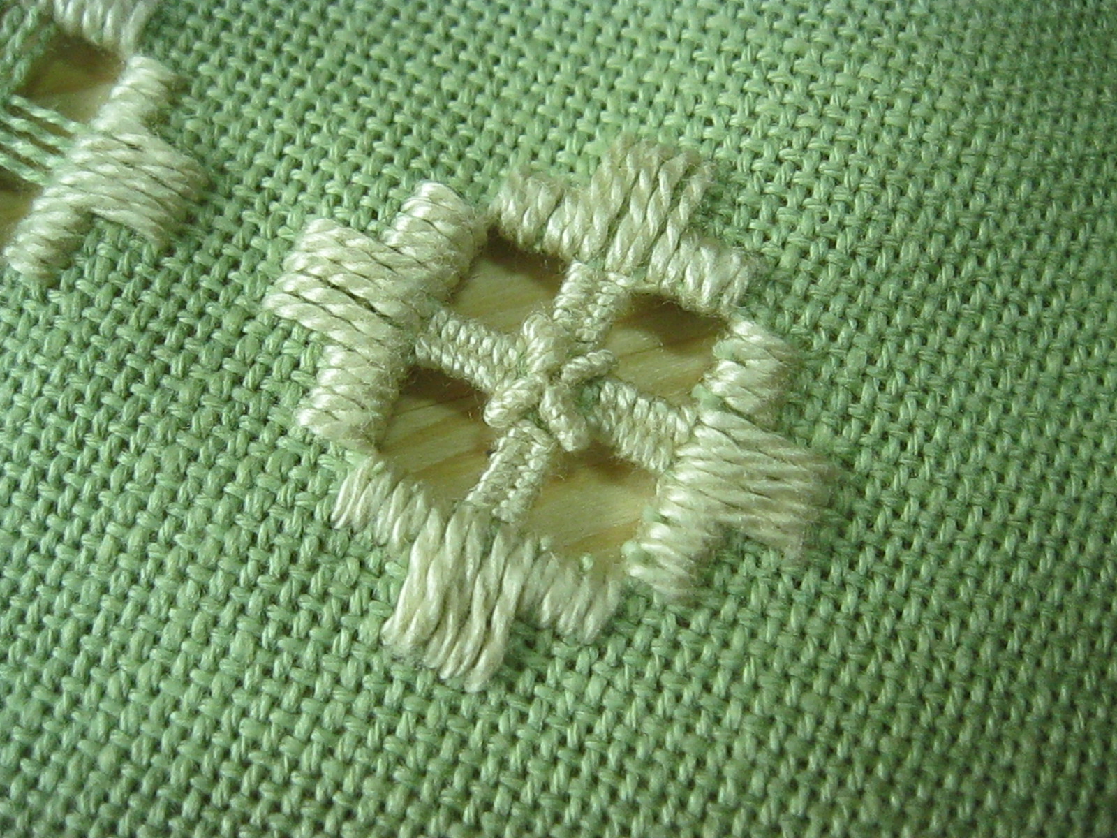 No boradado Hardenger comece por bordar as partes destinadas ao contorno dos abertos. Depois, passe ao corte e ao desfiar dos fios. De seguida, cubra os retículos. Os pontos no bordado Hardenger são: